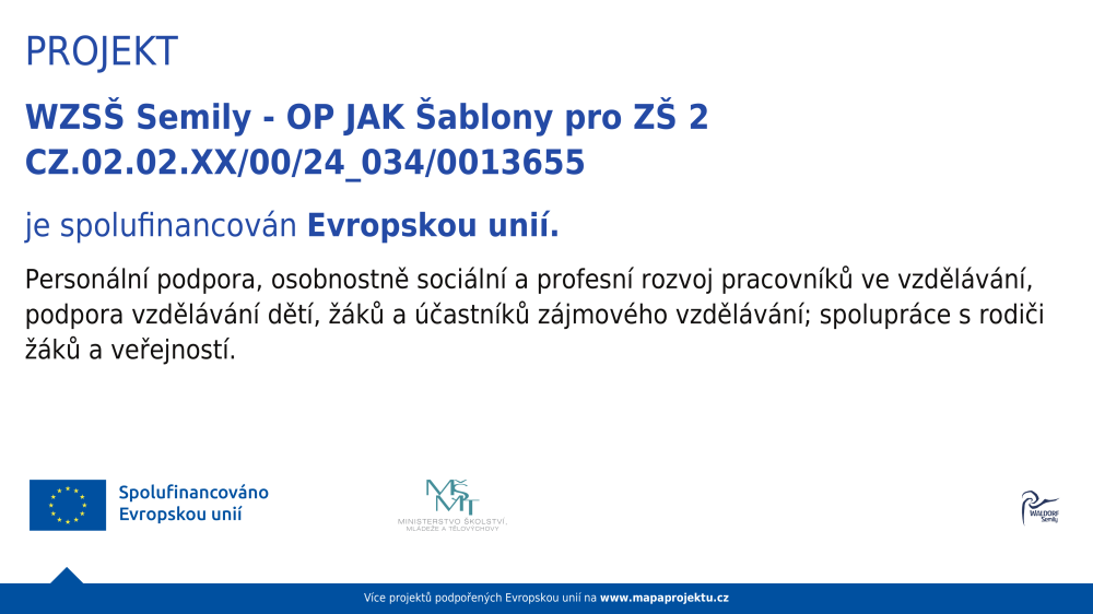 Naše základní škola je zapojena do programu OP JAK - Šablony pro MŠ a ZŠ II. Především díky tomuto programu můžeme zaměstnat školního asistenta, dále pedagogům umožnit další vzdělávání a zařadit i inovativní formy vzdělávání pro žáky - zejména projektovou výuku, zážitkovou pedagogiku a další.